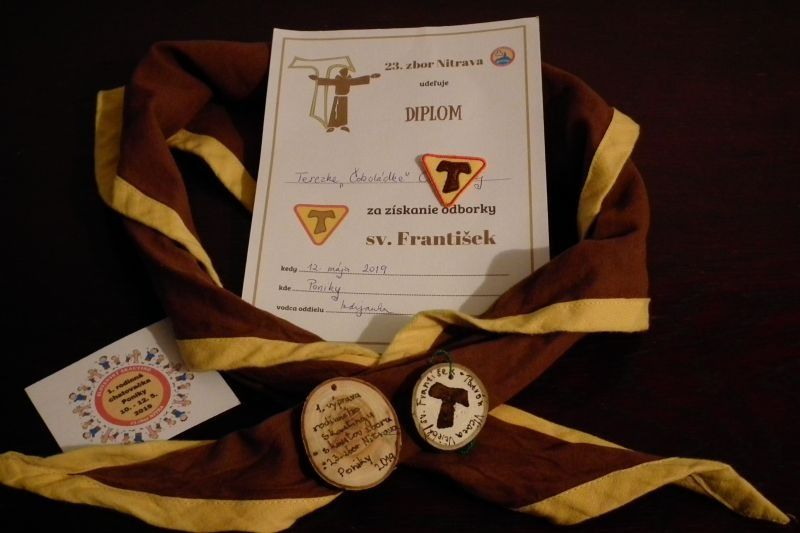 Poobede sme pokračovali etapovkou, ktorá nám pomohla splniť body odborky. Vyrobili sme jednoduché kŕmidlá pre vtáčiky, a vyrobili si drevené účastnícke placky s motívom sv. Františka. Vybehali sme sa pri hre o zvieratách. Naučili sa pracovať s mapou a buzolou. Etapovka skončila nájdením špeciálnej kešky, v ktorej nás čakali nášivky a odznaky.