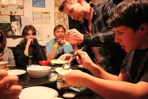 Keď Mikulášovi zaspievali alebo zarecitovali všetci účastníci (aj Anjel s Čertom) program pokračoval ďalej a to štedrou večerou na skautský spôsob, pri ktorej sme spolu ako veľká rodina papali výbornú šošovicovú polievku a iné výborné jedlá.