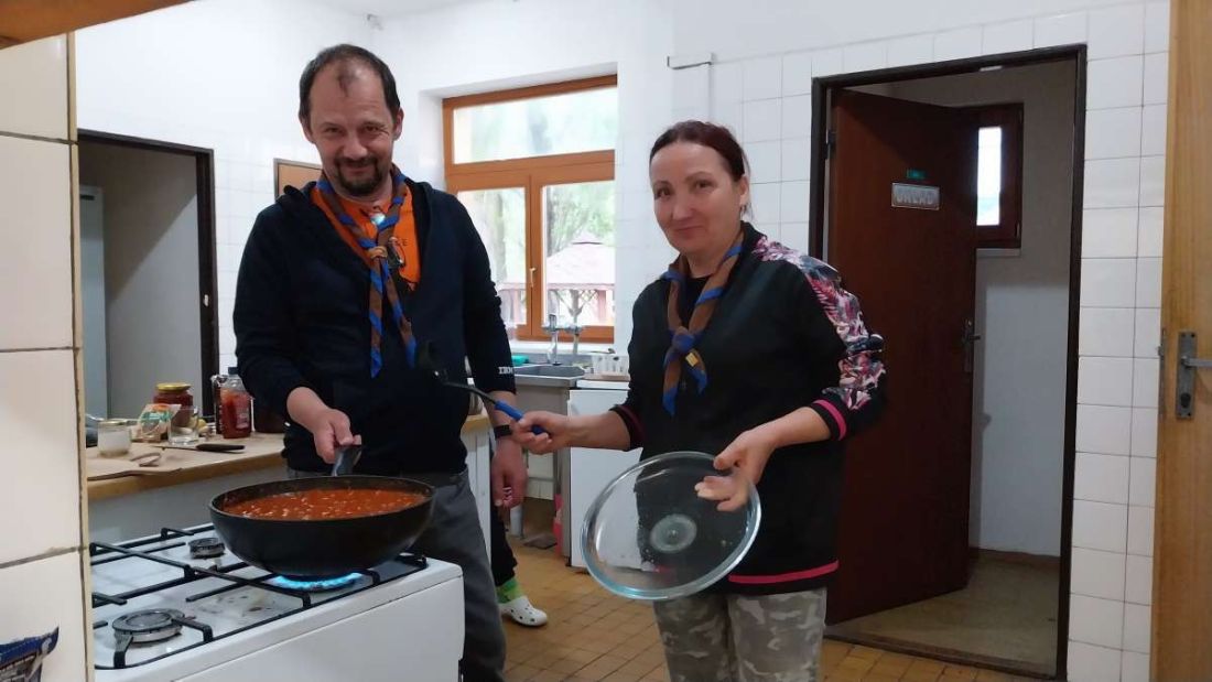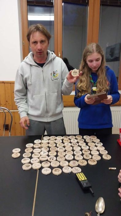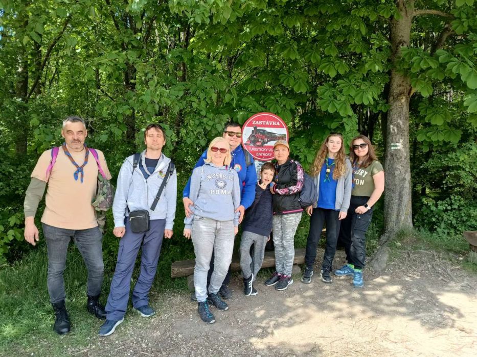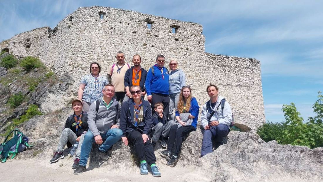 Každá rodina si pripravila jednu úlohu do spoločnej hry – a tak šliapeme po schodoch, rátame nápisy, hľadáme skautské symboly a rozmýšľame nad pravdivosťou miestnych legiend. Hrad pomaly ale isto ožíva – je to krásne miesto, ktoré určite stojí za návštevu. Občerstvenie, suveníry, spoločné fotky… a späť na chatu.