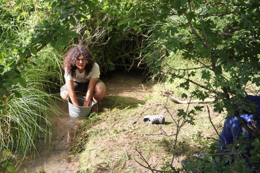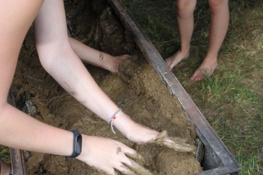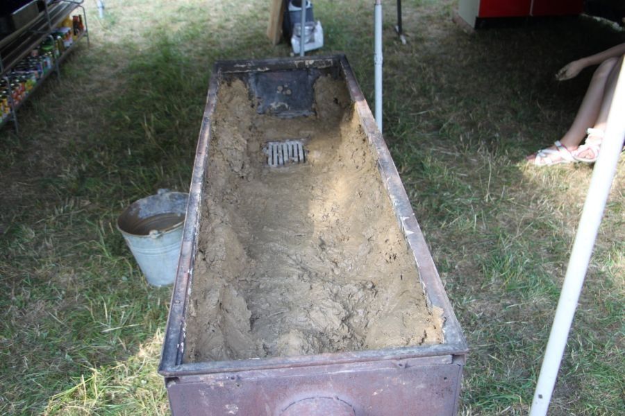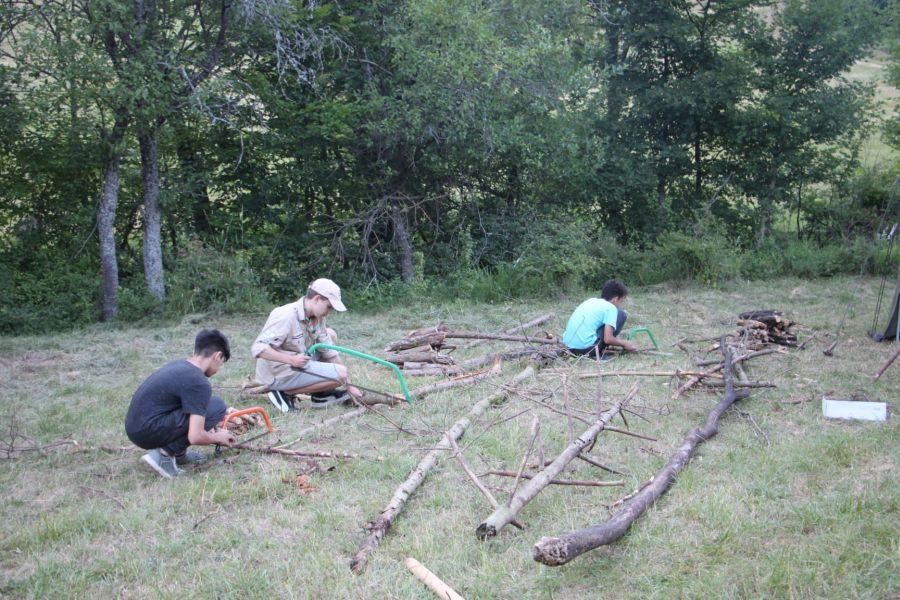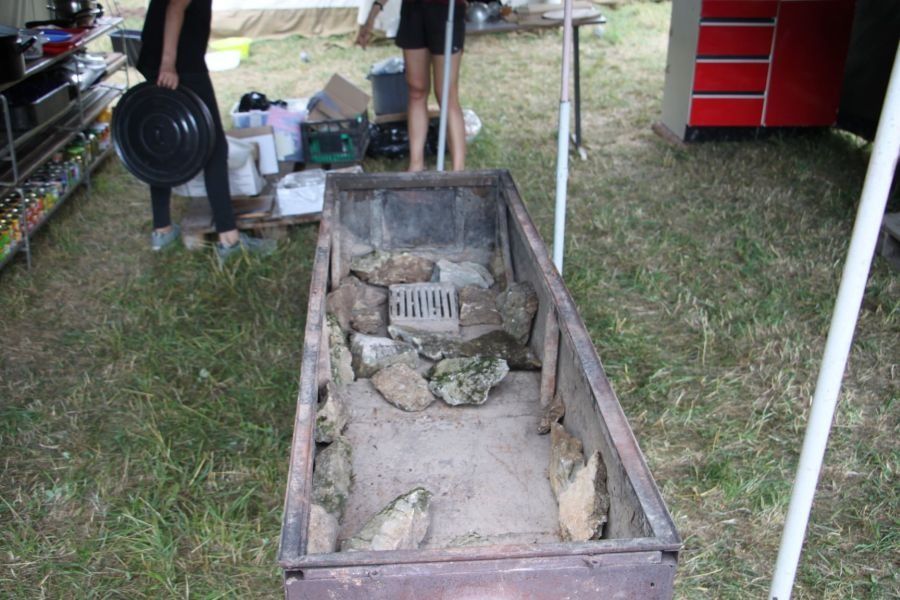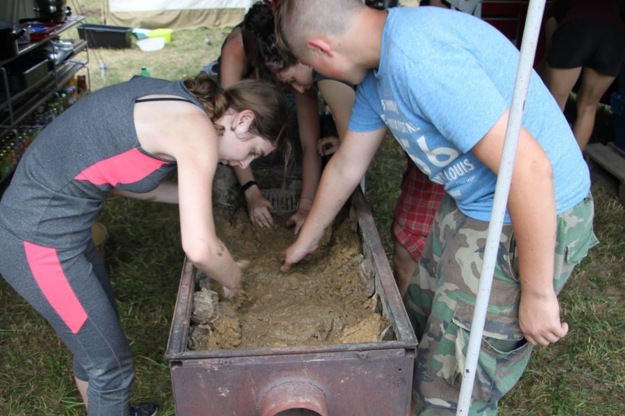 Chalani vo vode miešajú íl, zatiaľ čo baby hľadajú v lese kamene Tie z potoka by strieľali. Mladší skauti zatiaľ chystajú drevo. Pec sme vypaľovali celú noc aby bola pripravená na nedeľné ráno. Ak sa nič neodflákne pec slúži celých 16 dní v opačnom prípade treba pec opraviť.