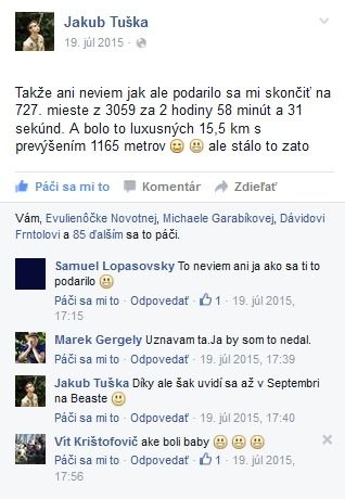 Potom sme si išli vyzdvihnúť registračné balícky, ktoré obsahovali číp na ruku, sparťanskú čelenku, náramok s časom nášho štartu. O chvíľu neskôr sme si išli pozrieť prvú voľnú?, ktorá štartovala o 10:00. Už sme sa išli len prezliecť a pripraviť na beh. Dali sme si rozcvičku a išli na štart. V posledných piatich minútach pre štartom som bol tak trochu naštvaný na Drina, že na čo ma to nahovoril, ale zároveň aj natešený na celý pretek. Pretek meral 7,34 km a mal asi 16 prekážok. Pri behu som ani nechcel veriť, že sme vystúpili až na hornú stanicu lanovky tesne pod Chopkom. V tú chvíľu som bol pred Drinom. Cesta do cieľa bola strmá a šmykľavá po čiernej zjazdovke. Do cieľ som dobehol v čase 1 hodina 46 minút a 42 sekúnd. Umiestnenie by som mal mať 916 z 2550. Cieľ bol vysekaný v ľade a mal podobu starovekého antického chrámu, kde sa tiež len ťažko dalo dostať. Tam som dostal medailu, tričko a teplý čajíček. Bol to nezabudnuteľný zážitok a lepšie si ho budem pamätať už aj len kvôli Denisovi Nagymu, ktorý pretek fotografoval. A týmto by som ku koncu a nakoniec chcel poďakovať Drinovu, že ma na to nahovoril.