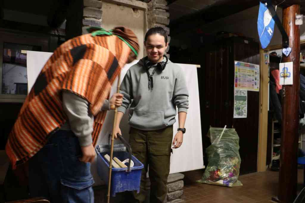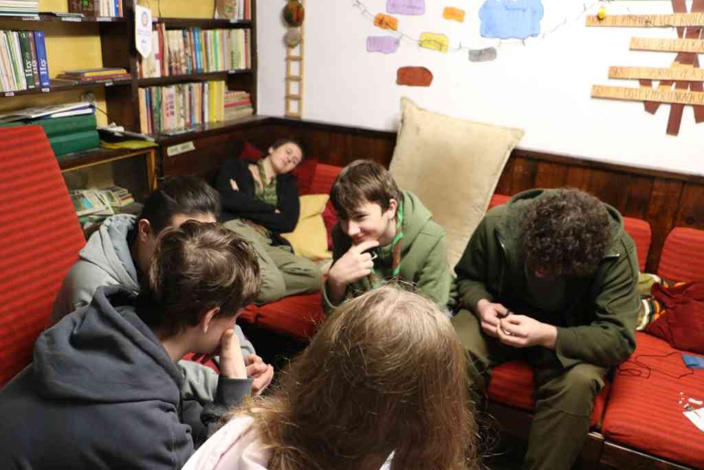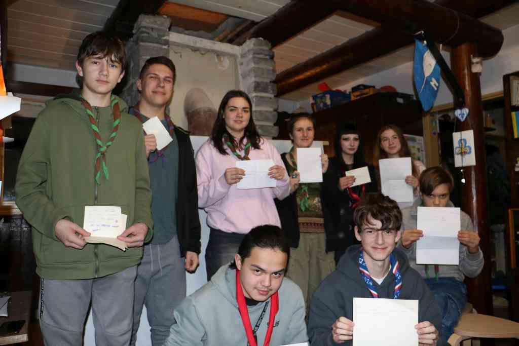 Následne sme dozvedali o význame jednotlivých symbolov/častí loga skautiek. Určovali sme sever - žilka, ktorá predstavuje stretku kompasu, hovorili sme svoje dobré skutky s posledných dní - Koreň stonky predstavuje plameň lásky ľudstva. Pantomomicky a kreslením sme znázorňovali skautksý sľub a zákon - Dve hviezdy predstavujú sľub a zákon. Za chrbtom sme viazali ambulančý uzol - Tri listy predstavujú tri časti sľubu, ktorý pôvodne pripravil Robert Baden-Powell. V tretej úlohe sme sa vybrali na návštevu do jednej z chát ktorú spravuje Wagggs. Naša skautka Škorica na jednej pred nejakým časom bola a tak sme si pozreli skvelé videá, a následne si čo to o tom ešte povedali.