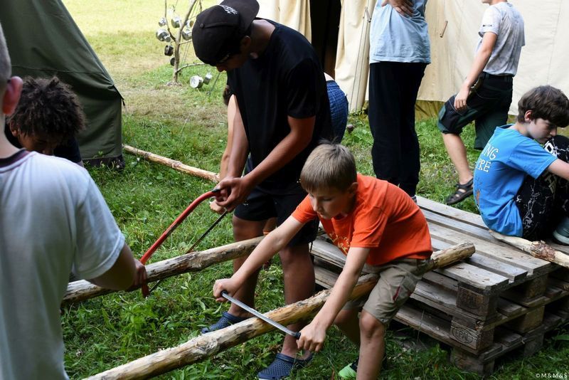 S prípravou materiálu sme začali už pred samotným táborom a na finálnej úprave dreva sa zúčastnili aj deti, ktoré sa nemohli zúčastniť na predtáborovej fáze. To bolo dobré pre už skúsenejších mladších účastníkov, ktorí sa na predtáborovej časti zúčastnili. Tí mohli svoje nadobudnuté poznatky naučiť svojich rovesníkov a overiť si ich v praxi. Za dozoru starších sme takto upravili drevené časti potrebné k stavbe a následne už aj s niektorými rodičmi spolu postavili Tee-pee.